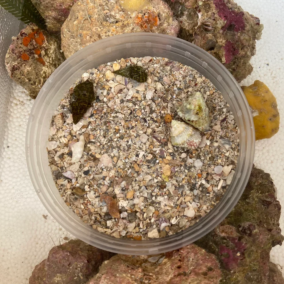 Cleanup crew (snails, crabs, sea stars, cucumbers) sourced locally when possible