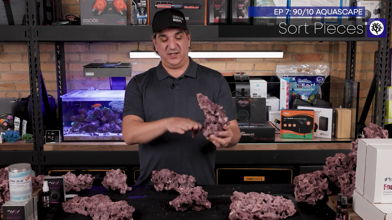 Sort pieces into three groups: flat ledge-friendly pieces, unique-shaped pieces (interesting contours), and round boulders. Use the unique shapes as focal points and ledges as real estate for soft corals.