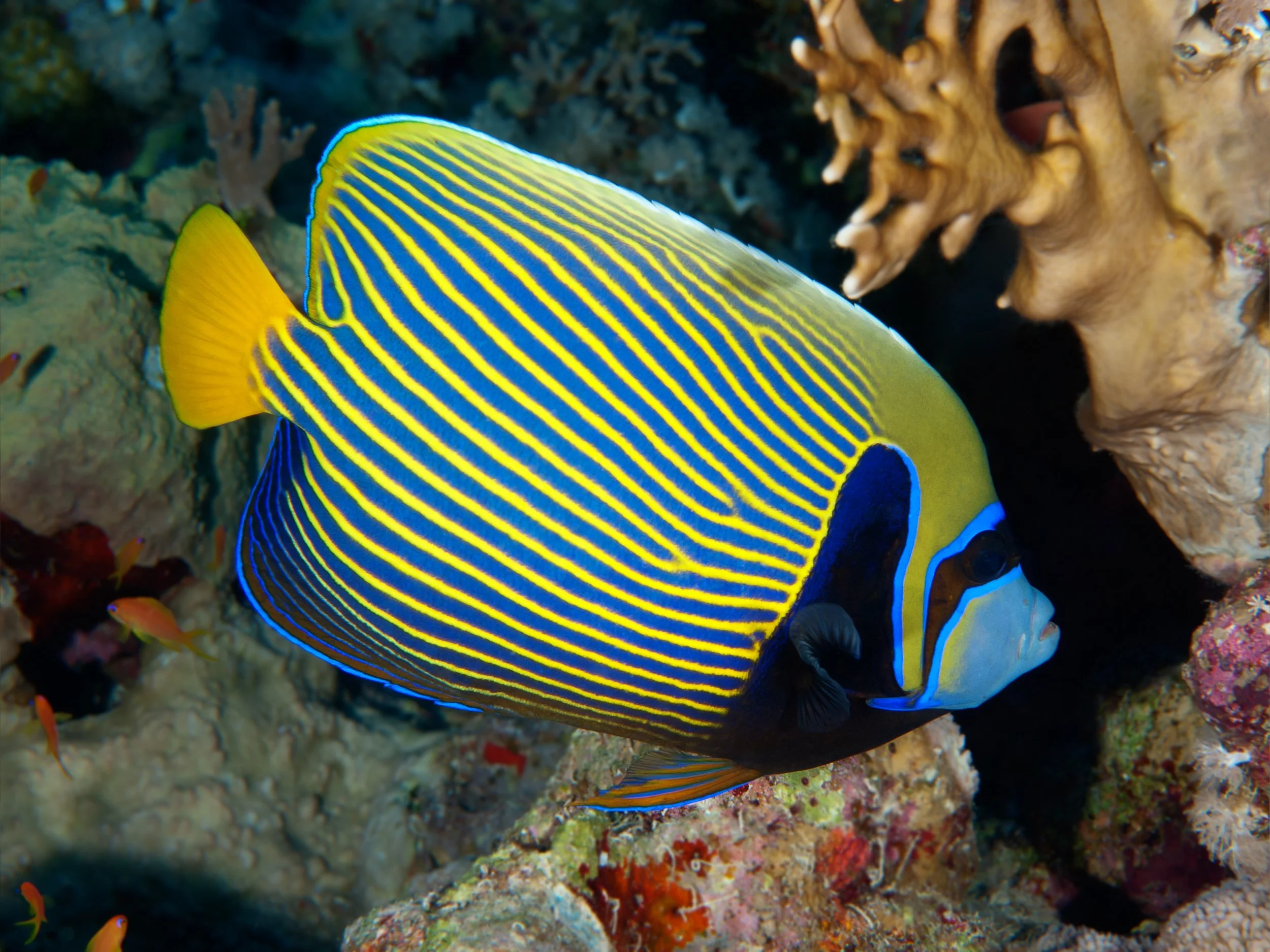 The transformation from juvenile to adult in the Emperor Angelfish is dramatically different. Juveniles look like a totally different fish: banded, high-contrast, and unmistakable. Adults develop bold, mature coloration and a very elegant profile. There are also regional color variants. For example, specimens from the Central Pacific or the Red Sea often show an orange tail and rounded ventral and dorsal fins, while fish from other regions tend to have yellow tails, a slight bluish-indigo body tone, and sometimes a streamer off the dorsal fin. The orange-tail variants are usually rarer and more expensive.