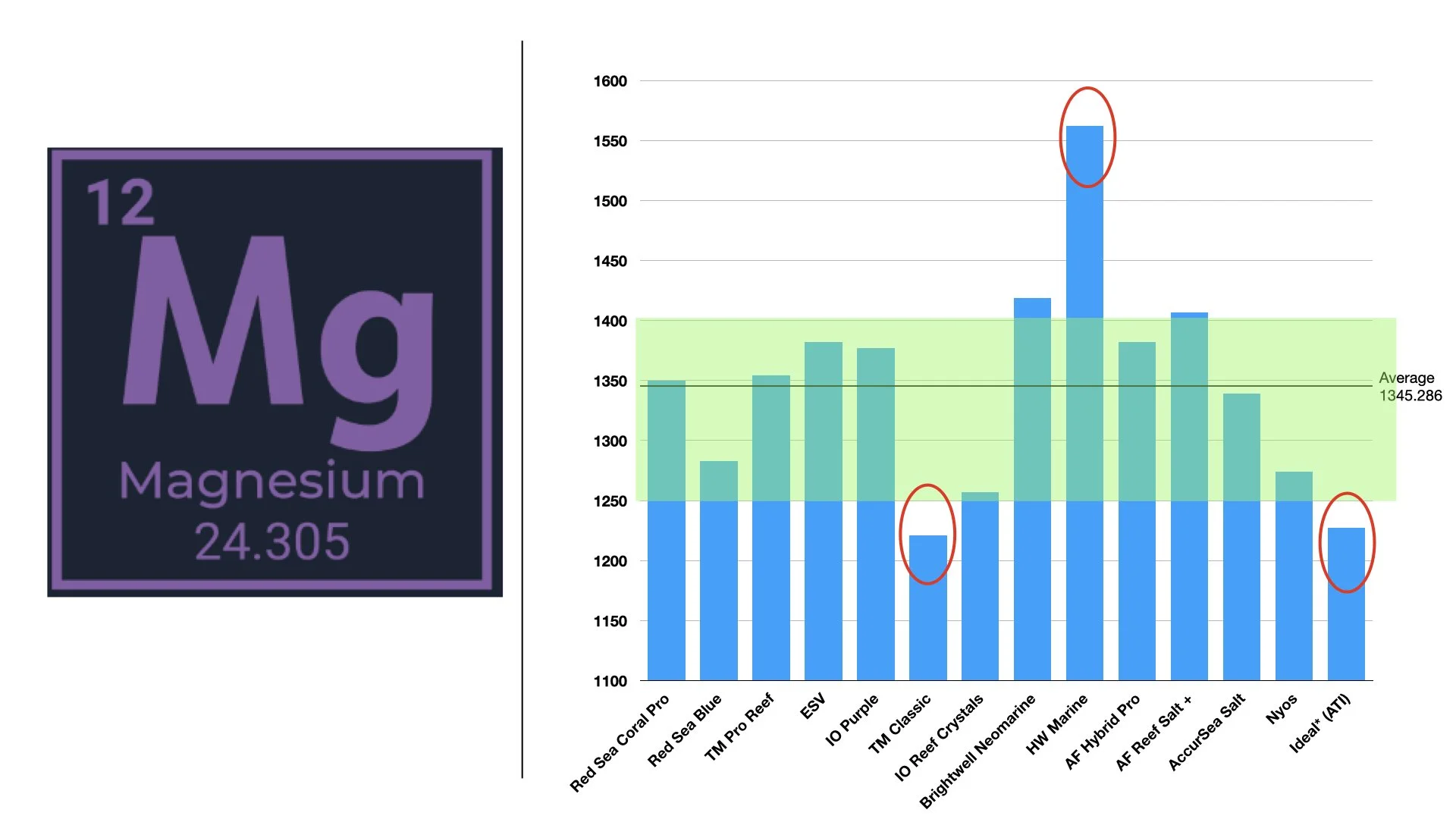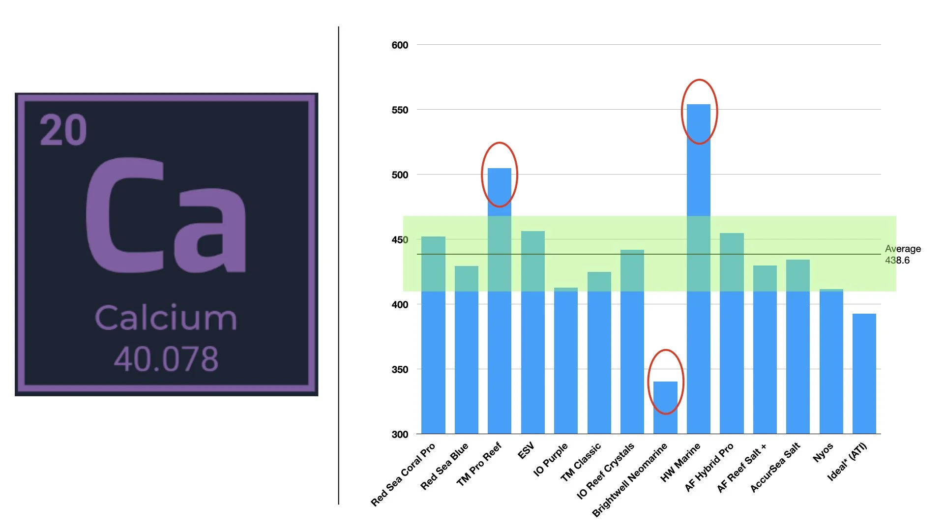 This approach gives two advantages: First, a broad scan shows which salts are close to natural seawater or the "expected" recipe. Second, it reveals outliers and buckets that fall well outside common ranges. Information like this can drive informed choices for our tanks.