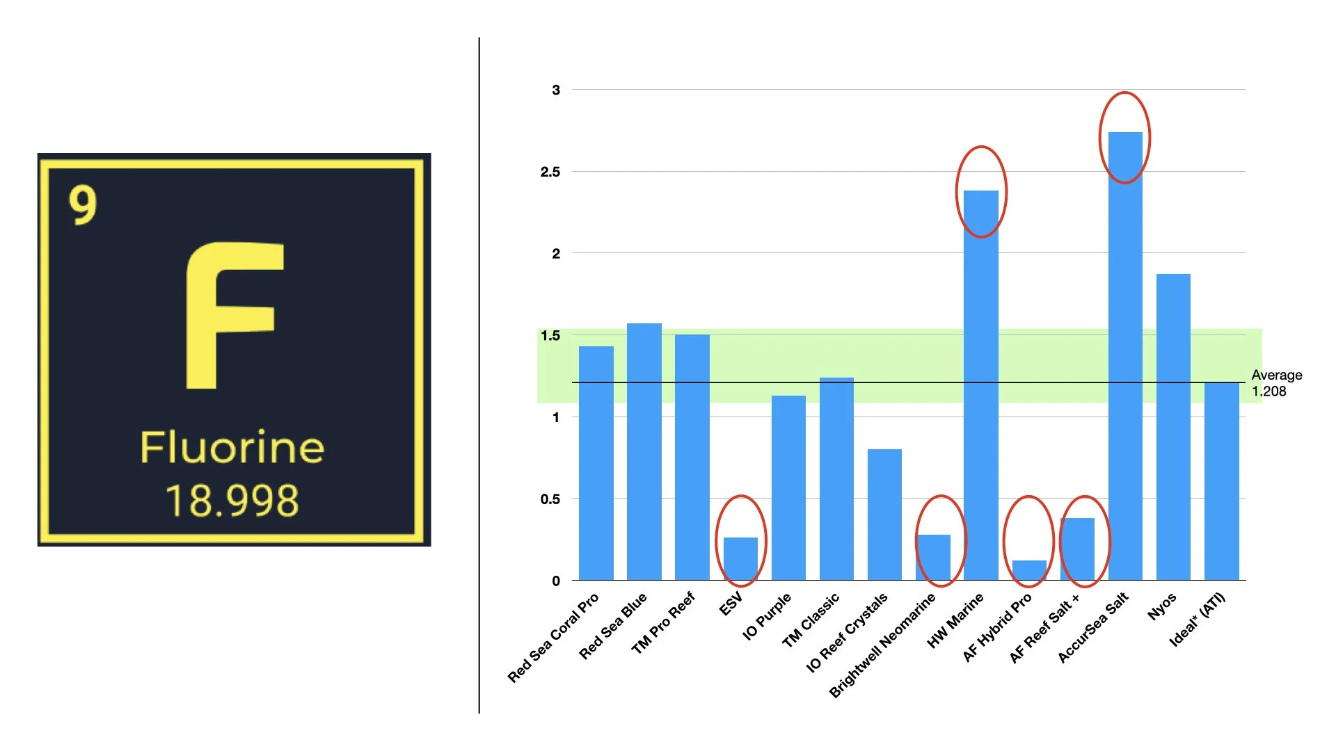 Fluoride showed wide variability. Several salts had low fluoride, while a few spiked higher than expected. Fluoride is a controversial trace element. Some reef products add fluoride to influence color in corals, but its biological role is not well established.