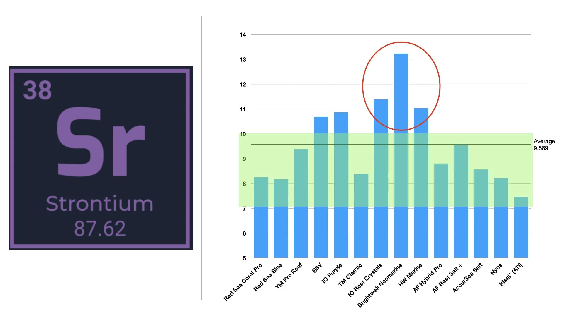 Strontium mostly sat in a reasonable range, but a handful of salts tested above typical surface seawater by a significant margin. Some manufacturers intentionally target elevated strontium to support certain coral growth scenarios.